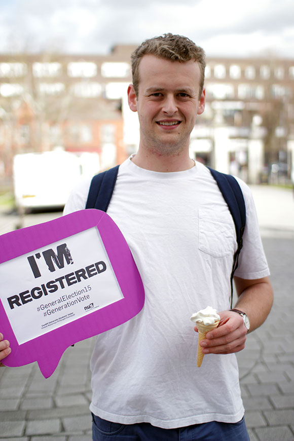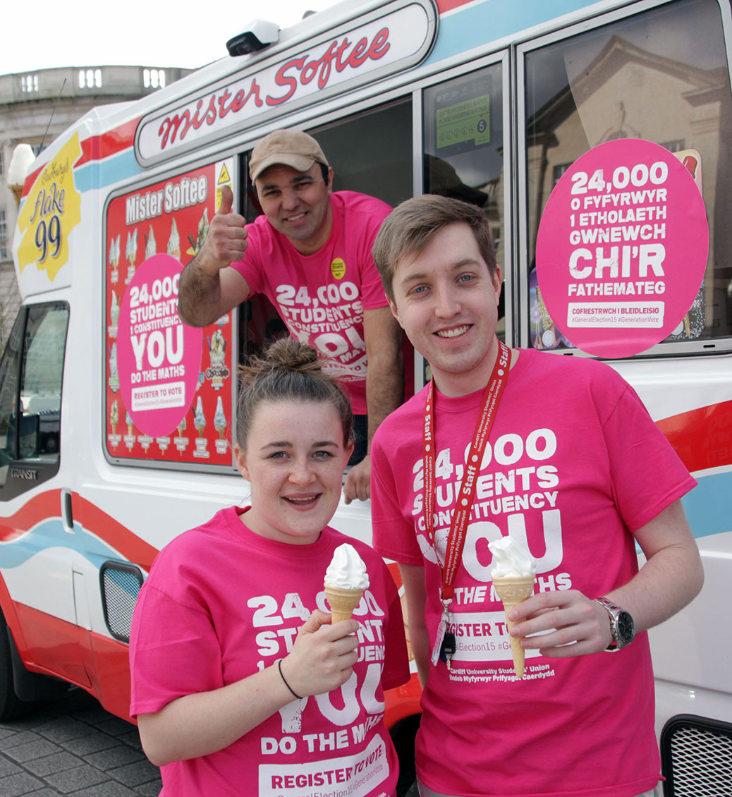We distributed 3,000 ice creams from ice cream vans encouraging registration, getting coverage on local media. We had games at the sites, educating participants on party policies making students think about who they’d want to vote for.