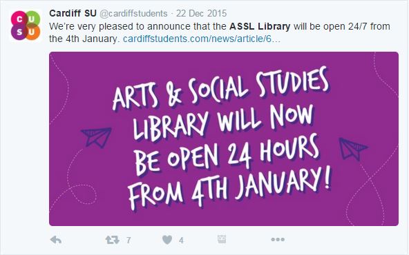 - The Arts and Social Studies Library now opens 24 hours a day during term time as a result of feedback obtained during Speak Week 2016, and a lot of lobbying from our Sabbatical Officer team that followed.