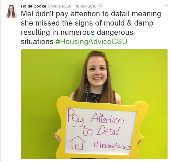 The Welfare Exec, with the Advice Exec and the GIAG Exec which are all made up of students, seven sabbatical officers, eight members of Union staff, two members of Student Support University Staff, two University lecturers and one local authority council representative attended 14 different Halls of Residence during Housing Fortnight and knocked on over 2000 individual rooms. The Welfare Exec were very hands on in assisting with the logistical running of Mind Your Head Week. Hollie, our VP Welfare, has met with the Exec every week where they have guided and informed the issues and campaigns that Hollie has been working on. All members of the Welfare and Advice Execs were chosen through a rigorous recruitment process, mainly drawn from a large body of Freshers’ Week support volunteers and our Student Led Services.