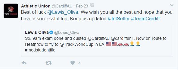 The Athletic Union Exec is made up of 7 students and has helped run events such as #ThisCardiffGirlCan and Welsh Varsity. They have also led on the introduction of the AU twitter account, which has gained 421 followers in 3 months.